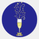 Great blue and gold New Years Eve party envelope stickers, with graphics of a filled champagne glass, decorated with a pretty gold tone bow, on the stem, and streams of sparkles shooting up from the glass. Elegant way to finish off your holiday party invitations.