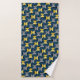 This towel set has a mid-century modern design of ovals in navy with semi-circles in shades of yellow and shades of grey in them on a field of black.