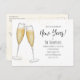 This design features a simple new years eve day, party champagne wine celebration festive, trendy stylish gold bubbly toast, a watercolor champagne flute glasses glass, a guest pre-addressed address list, elegant calligraphy script text font, a whimsical typography style design, a modern Christmas holiday glitter, a classy-vintage retro cute simplistic, family friends get together party, a budget-friendly postcard cute festive