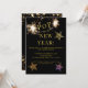 POP ! New Years party invitation with sparklers, gold stars, gold text and reverse has white poinsettias.