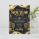 This beautifully designed New Year's Night Party Invitation features a gold frame of a gold disco ball, an abstract swirl, and champaign glasses on a black background. Customisable white and gold typography.