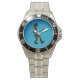 Has heft and feel of expensive stainless steel quartz watches. Good band with safety catch. I removed links, which is easy because engraved arrows show direction to push the linking pins. As always by this seller, the image (a railroad logo) is a perfect reproduction of my emailed image, and is precisely spaced and aligned.
