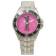 Has heft and feel of expensive stainless steel quartz watches. Good band with safety catch. I removed links, which is easy because engraved arrows show direction to push the linking pins. As always by this seller, the image (a railroad logo) is a perfect reproduction of my emailed image, and is precisely spaced and aligned.