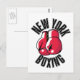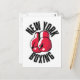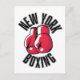 The image features a pair of red boxing gloves, positioned in a classic fighting stance, with the words "NEW YORK BOXING" in bold black lettering surrounding them. The gloves are detailed with white accents and yellow laces, adding a touch of realism to the design. The background is a simple white, allowing the vibrant red of the gloves and the bold black text to stand out.