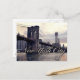 A postcard featuring the Manhattan skyline against a sunset, with the Brookyln Bridge in the foreground.