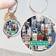 New York City keychain featuring a colourful photography of the artistical architectur of the city, the typical green and white city sign and the customisable text "New York City".