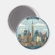 An illustration of New York City captures the skyline rising majestically in the background, showcasing landmarks like the Empire State Building, evoking the city's dynamic spirit and timeless allure.