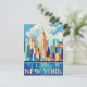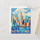 A vibrant and colourful illustration of a famous city skyline, featuring iconic skyscrapers and landmarks. The image captures the dynamic energy and architectural grandeur of the city, with its towering buildings and bustling streets. The overall style is bold and graphic, with a focus on the city's iconic skyline.