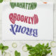 A typographic design the initials NYC, featuring the 5 boroughs of New York City - Bronx, Manhattan, Queens, Brooklyn and Staten Island.