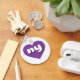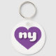 This keychain features a vibrant purple heart containing the bold, white, rounded lower case letters ny, a playful version of the abbreviation for the state of New York.