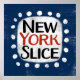 A fun and cute typographic message design that says "New York Slice". It has black and red text on a white rectangle with funky, playful white dots surrounding it, all on a blue background.