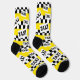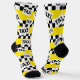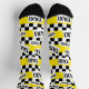 Novelty yellow socks patterned with black and white checkerboards, and taxi signs. Fun gift for taxi drivers.
