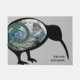 New Zealand kiwi bird in black adorned with a sparkly, shiny, blue, green pāua shell colour body overlaid with a curved green fern koru. There is custom text at the base of this NZ design if you want to add a name, message, kia ora, or other personalised text. The Kiwi bird is an icon for Aotearoa NZ being both a native bird and the name adopted by New Zealanders in reference to themselves. On this piece it is set against a silver grey colour.