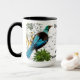 A coffee mug with a North Island, New Zealand map, Kowhai flowers (Native tree), a fern and a tui (Native bird)
