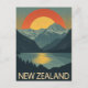 This striking card features a vintage-style illustration of a scenic New Zealand landscape. The design showcases majestic mountains and a serene lake reflecting the warm glow of a large, setting sun. It captures the country's famous natural beauty with a classic, retro aesthetic. The bold "NEW ZEALAND" typography completes the look, making it a perfect memento or greeting for any nature lover or traveller.