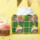 An adorable watercolor illustration of a Newfoundland, pairs with a green and gold holiday plaid patterned background, and the dog wears a gold winter scarf and Santa hat.