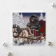 Beautifully hand drawn and coloured Newfoundland puppy dog featured in a winter wonderland, horse pulled Santa sleigh carriage