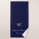 Newlyweds Gift Modern Monogram Initial And Bride and Groom Names Chic Navy Blue Bath Towel Set. Stylish personalised navy blue and gold monogrammed bath towel set. Classic script for the monogrammed last name initial, the names of the bride and groom and the marriage date on a