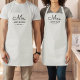 For the bride and groom, this white apron features "Mr." in a modern script font along with a last name and established date. This is a perfect bridal shower or wedding gift. These Mr. and Mrs. aprons are available in a variety of colours.