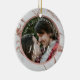 This customizable ceramic holiday decorative couples ornament is templated so all text can be easily modified, and your photo can be quickly added. it features a simulated sparkle white marble with rose gold glitter base, and a simple rose gold simulated metallic foil circular frame. It's identical on both sides, with the exception of the marble pattern. For best results, use a well-cropped 1:1 (Square) Photograph.