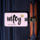 Trendy, chic blush baby pink honeymoon luggage tag. Design features typography script ''wifey'' in bold black lettering on a bright baby pink background, gold heart, name and a year established. Personalize with your address and contact details on the back. Perfect for honeymoon, as a newlyweds gift or keepsake.