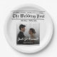 newspaper wedding table number plates, custom photo wedding paper plates, modern wedding table decor, black and white wedding plates, editorial wedding theme plates, personalised wedding tableware set, table number reception paper plates, unique wedding plate design, wedding plates with table number, minimalist wedding paper plates