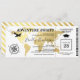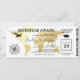 Boarding pass graduation party ticket invitation featuring a elegant gold foil destination world map, compass, aeroplane, graduate cap, and a personalised text template.