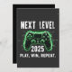 next level 2025, gaming lover, gamer humour, level up, play win repeat, video game enthusiast, funny gaming quote, new year gamers, gaming lifestyle, gaming celebration, console gamers, gaming pad design.
