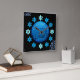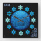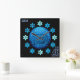 Perfect for the Jewish home, this wall clock features an original design set on black. At center is digital painting of a round blue piece of burlap stamped w/a familiar view of Jerusalem shaded to mimic a sphere w/ caption "NEXT YEAR" arched above & "IN JERUSALEM" in staggered block letters at bottom right. Hour markers are backed by individual 6 pointed stars. Personalize initials at top left or clear.