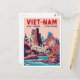 Escape to the stunning coastline of Vietnam with this dramatic vintage travel poster style postcard featuring Nha Trang and Cam Ranh. The design showcases a striking landscape of rugged, reddish-pink rock formations, vibrant palm trees, and clear blue waters, with a figure in traditional yellow and red attire. The bold, contrasting colors and graphic style give the scene a powerful, retro-exotic feel. This postcard is perfect for celebrating the beautiful beaches and unique geology of Southeast Asia, decorating with retro art, or sending a memorable greeting from this tropical destination.
