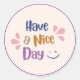Add a touch of positivity to your belongings with our "Nice Day" round sticker! Featuring a vibrant and cheerful design, this sticker is perfect for brightening up your laptop, water bottle, notebook, or any surface that needs a little extra joy. The colourful background and playful font make it an eye-catching addition to your collection. Whether you're gifting it to a friend or keeping it for yourself, this sticker is a daily reminder to stay positive and have a nice day!