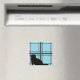 This magnet is inspired by Nicky's favourite past time: looking out the window. The pale blue background represents the early morning sky, while the dark grey lines represent windowpanes. The little doggy himself makes an appearance as well.