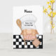The card showcases a whimsical gnome chef with two adorable ponytails, wearing a chef's hat and apron. The gnome is engaged in cooking, holding a wooden spoon, and the kitchen scene is set against a charming chequered background. The overall design reflects a playful and lighthearted atmosphere. Add the name on the centre of the chef hat the gnome is wearing.