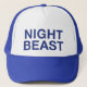 NIGHT BEAST fun and ironic slogan on trucker hat, blue, funny typographic statement, inspired by tv comedy character frank rossitano.