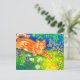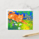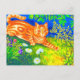 Postcard featuring Louis Wain’s animal painting Cat Stalking (1860-1939). An orange striped cat walks a green field at night. White, purple, and red flowers are in the foreground. A wonderful gift for cat lovers and English art.
