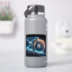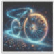 A solitary cyclist rides a glowing bicycle towards a swirling, vibrant vortex filled with stars and radiant colours.