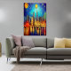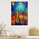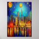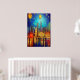 Colourful art of a city by the lake in the night, many stars and two moons in the sky, fancy skyline with small building and skyscraper. This is a AI generated art.