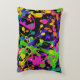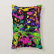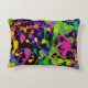 This fun throw pillow features paint splatters in bright yellow, lime green, orange, teal, violet blue and hot pink. The black background really sets the colours off.