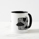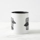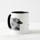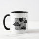 Black and white mug with magic night graphic illustration. Half moon, clouds and stars ink drawing.