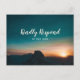Elegant and modern wedding RSVP template postcard. Background is a beautiful photograph of a dark turquoise blue night sky with a galaxy of stars above and a sunrise over mountains below. The text is fully customisable and appears in a stylish combination of handwritten script and sans serif fonts.