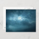 Photo collage, combining multiple images of storm clouds, and a moon photo. The result is an atmospheric, dark blue night sky, with a glowing full moon shining through the clouds.