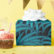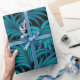 Turquoise and teal graphic palm leaves on dark blue background