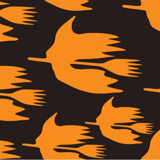 Fun, simple, halloween image of orange silhouettes of a witches riding brooms against a solid, off-black, night sky background. This image also matches the 'Hello Witch' Halloween collection.