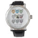 A woman can never have too many cats in her lifetime. The design on this cute feline themed watch sums up my personal view with a slogan that's a play on the cats have nine lives idea. The wording reads 'Every life should have nine cats.' The saying is teamed with illustrations of nine cartoon style smiling cats with black curly tails. The cats are in retro look colours including shades of purple and mauve, green, blue, orange, soft lime and grey. The watch would be the perfect gift for the cat lover in your life.