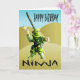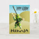 A ninja on the hillside in green camouflage throwing a shrunken and a staff on his back, with the message Happy Birthday Ninja.