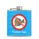 The flask itself is fine. It’s a cheap flask, obviously bought in bulk, however am prepared to overlook that. Given that it is a personalized item, I would have liked to have seen gift boxing instead of the generic packaging. Terrible printing, and/or quality. It’s a cheap, tacky vinyl. It is not cut straight and is also applied in a way that it is overhanging the bottom, causing the glue to catch on items and it will eventually roll and tear, damaging the wrap.