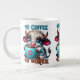 A funny and sarcastic design features a cute highland cow sitting with a steaming coffee mug that has a lipstick kiss mark on the front. The cow, with big blue eyes, glasses, and a soft expression, has black and white fur. Bright, colourful text reads: "No coffee, no workie." This playful design is available on various products, making perfect gifts for coffee lovers.