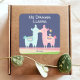 “No Drama Llama”. A sweet, playful visual of two cute, cool, kawaii, light pink and light aqua blue llamas kissing and fun, handwritten typography overlays a dark midnight blue grey background. Have fun plastering everything you own with these adorable, trendy kid’s custom name stickers. Personalise with your name. Makes a stylish statement every time you use them. Great for back to school!