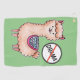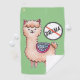 Cute watercolor painting of a whimsical tan llama with a multi coloured patterned cloth on its back. A sign to its side with a red line through the word drama in black letters.