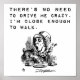 "There's no need to drive me crazy. I'm close enough to walk." A clear, simple -- and very funny -- statement, presented in black and white with a plain, and a little edgy, block font that looks like it was created with one of those label making gadgets. The Mad Hatter is holding forth in the illustration, although the quote isn't really in "Alice," and cars weren't around to drive him anywhere anyway. And here it all is on a poster that you can hang to warn friends and family that they might want to keep you at arm's length. (There are lots of print sizes to choose!)